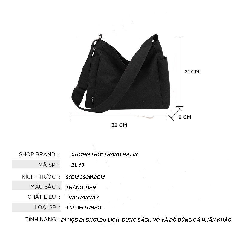 Túi tote đeo chéo vải canvas dày bền bỉ, kháng nước thời trang đeo đi học đi chơi TÚI TOTE giúp bạn trở nên xinh đẹp lộng lẫy hơn mỗi khi đi ra ngoài, đi học, đi làm, đi chơi mà không phải cầm mang những vật dụng linh tinh vướng víu. Túi Vải còn là món phụ kiện thời trang sang trọng làm quà tặng, đi chơi, dự tiệc mà còn là vật hộ mệnh cho đường tiền bạc của bạn. Hãy chọn cho mình 1 chiếc túi hợp dáng người, hợp màu sắc làm tăng vẻ đẹp của trang phục bạn mặc tạo ấn tượng trong mắt người đối diện bạn nhé. Túi được phát triển đa dạng, đa phong cách unisex có thể phù hợp cho cả nam và nữ phân khúc từ giá rẻ đến chính hãng, tất cả những điều này tạo cho túi đeo chéo trở thành những phụ kiện không thể thiếu mỗi khi ra đường bởi vậy từ khóa túi đeo chéo nam và túi đeo chéo nữ luôn là những cụm từ được tìm kiếm nhiều nhất khi được nhắc đến trong thế giới túi. ĐẶC TÍNH VẢI CANVAS/ VẢI BỐ - Giữ màu tự nhiên - Đồ bền chắc ưu việt - Khả năng chịu nước, chống cháy & kháng nấm mốc tốt. - Vải nhẹ & dễ dàng vệ sinh THÔNG TIN SẢN PHẨM • SHOP BRAND : hazisstore • MÃ SP : • KÍCH THƯỚC : 21cm (cao) x 8cm (rộng) x 32cm (ngang) • MÀU SẮC : Trắng/Đen • CHẤT LIỆU : Vải canvas/ vải bố • LOẠI SẢN PHẨM : Túi đeo chéo • TÍNH NĂNG : Đựng tài liệu, sách vở, ipad, đồ cá nhân, ví, điện thoại… Hướng dẫn bảo quản: - Giặt riêng sản phẩm màu sáng và màu tối - Giặt sản phẩm với nước ở nhiệt độ thường - Nên phơi mặt trái sản phẩm, không phơi dưới ánh nắng trực tiếp - Không nên sử dụng chất tẩy, không xoắn vắt mạnh Lưu ý: - Không đổi trả với lí do không ưng ý với sản phẩm - Do màn hình và điều kiện ánh sáng khác nhau, màu sắc thực tế của sản phẩm có thể chênh lệch khoảng 3-5% Cam kết shop: - Đổi trả miên phí trong vòng 3 ngày nếu nhận sai sản phẩm hoặc hàng lỗi do nhà sản xuất - Kiểm tra sản phẩm kỹ trước khi gửi hàng Shop Đảm Bảo Sản Phẩm Đúng Hình Ảnh và Chất Lượng! Quy định đổi trả hàng: 1. Điều kiện áp dụng (trong vòng 07 ngày kể từ khi nhận sản phẩm): - Hàng hoá vẫn còn mới, chưa qua sử dụng. - Hàng hoá bị lỗi hoặc hư hỏng do vận chuyển hoặc do nhà sản xuất. 2. Trường hợp được chấp nhận: - Hàng không đúng size, kiểu dáng như quý khách đặt hàng - Không đủ số lượng, không đủ bộ như trong đơn hàng 3. Trường hợp không đủ điều kiện áp dụng chính sách: - Quá 07 ngày kể từ khi Quý khách nhận hàng. - Gửi lại hàng không đúng mẫu mã, không phải sản phẩm của shop. - Không thích, không hợp, đặt nhầm mã, nhầm màu,.. Hazis Store chúc quý khách có một trải nghiệm mua hàng tuyệt vời #tuideocheo #tuideocheonam #tuideocheonu #balonu#tuideocheonam #tuivai #tuitote #tuideocheohanquoc #tuideocheogiare #tuideocheohot #tui #tuinu #tuideocheo #tuideocheonam #tuideocheonu #tuideocheocanvas #tuideocheodihoc #tuideocheodichoi #tuideocheogiare #tuideocheochinhhang #tuideocheomini #tuideocheonhieungan #tuibaotu #tuideocheocute #tuideocheou