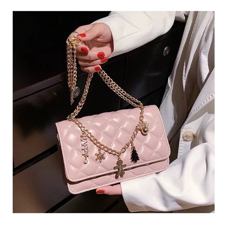 Túi xách nữ đeo chéo đeo vai trần trám trang trí dây xích DiDiBag mã 05 Túi xách nữ đeo chéo đeo vai trần trám trang trí dây xích DiDiBag với sự kết hợp tinh tế từ các dây xích nhỏ gắn móc treo các hình dễ thương , khi kết hợp phối đồ sẽ tăng thêm vẻ đẹp cho trang ph