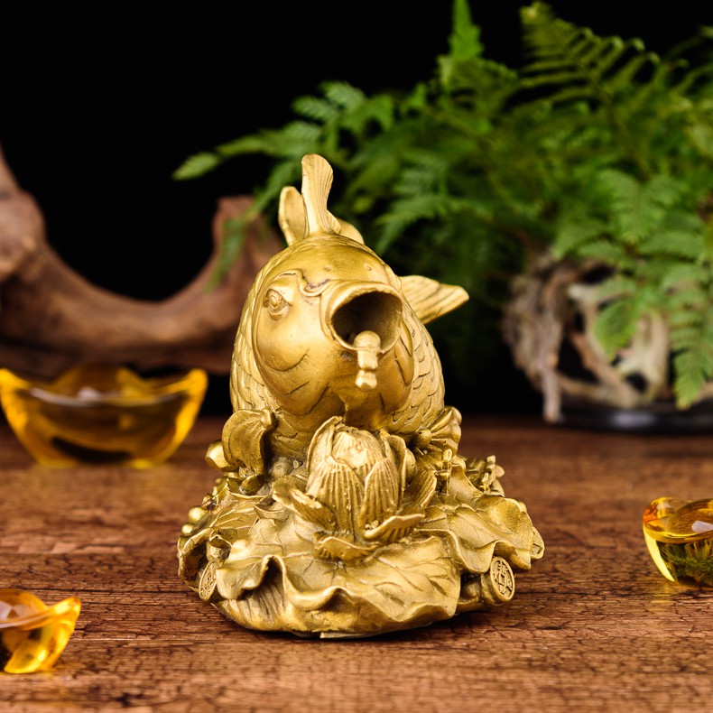 Tượng cá chép cưỡi hoa sen phun châu bằng đồng thau phong thủy Hồng Thắng Chất liệu : Đồng thau Kích thước : Dài 18cm* cao 11cm* rộng 7cm Số lượng: 1 tượng