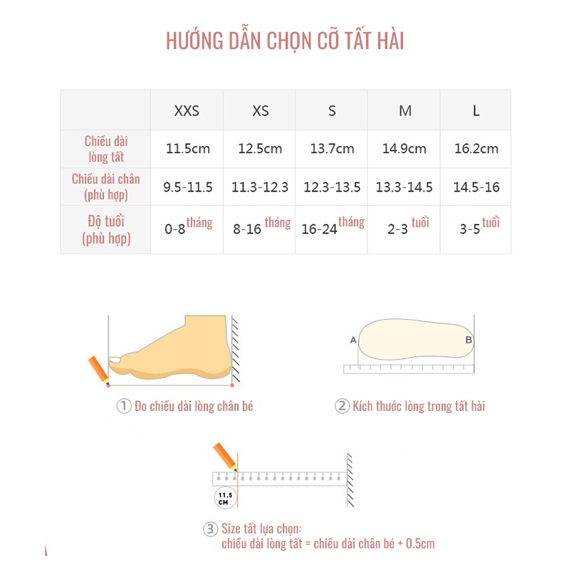 Tất hài cho bé tất lười chống trượt [ cú 3D ] vớ đi trong nhà cho cho trẻ em QS SOK113 ✪ Giới thiệu : - Kích thước phù hợp: tất hài cho bé có kích thước 12-16cm có độ co giãn tốt cho trẻ 1-5 tuổi do đó bạn có thể lựa chọn kích cỡ phù hợp theo kích thước bàn chân của bé. - Chất liệu cao cấp: lớp trong của vớ chống trượt được làm bằng vải polymide, ấm áp, mềm mại và thoải mái; lớp ngoài bằng nhung rất đẹp và tăng thêm nét duyên dáng cho bàn chân các bé. - Thiết kế chống trượt: tất hài chống trượt cho bé trai và bé gái này đươc làm tỉ mỉ và các hạt silica gel chống trượt được phân bổ đều ở mặt dưới của tất, giúp cho tất có ma sát tốt và có thể chống trơn hiệu quả trong quá trình bé tập đi. - Hoạt động thích hợp: tất hài cao cổ (hoặc vớ thấp cổ) đẹp và thoải mái này thích hợp cho các hoạt động thể thao của trẻ em, cầu trượt, bạt lò xo, hay chỉ đơn giản là đi trong nhà. ✪ Mô tả : - Tăng sự quyến rũ cho trẻ em: Tất vớ hài tập đi này có màu sắc tươi sáng, kiểu dáng đơn giản và chất liệu mềm mại, các bé sau khi mang sẽ trở nên an toàn và thoải mái hơn. - Ăn mặc thoải mái: Đôi tất hài chống trơn cho bé này được làm từ chất liệu vải cotton và nhung mềm mại, mang lại cảm giác thoải mái khi mặc, có thể giữ ấm, chống trơn trượt, bảo vệ đôi chân của trẻ. ✪ Thông tin sản phẩm : - Thương hiệu: - Chất liệu: 80% cotton 17 polyamide 3% elastane - Kích thước: XXS (0 - 8 tháng): chiều dài 11.5cm -> chiều dài chân bé: 9.5-11.3cm XS (8 - 16 tháng): chiều dài 12.5cm -> chiều dài chân bé: 11.3-12.3cm S (16 - 24 tháng): chiều dài 13.7cm -> chiều dài chân bé: 12.3-13.5cm M (2 - 3 tuổi): chiều dài 14.9cm -> chiều dài chân bé: 13.3-14.5cm L (3 - 4.5 tuổi): chiều dài 16.2cm -> chiều dài chân bé: 14.5-16cm - Họa tiết: động vật - Khối lượng: 100g - Độ tuổi phù hợp từ 8 tháng - 4.5 tuổi - Mùa phù hợp: Xuân, hạ, thu và đông. - Gói hàng bao gồm: 1 đôi/túi ✪ Hướng dẫn đo chân chọn size tất hài: - Bước 1: Đặt tờ giấy vào phía dưới lòng bàn chân của bé - Bước 2: Đánh dấu 2 điểm gót chân và đầu ngón chân dài nhất lên tờ giấy - Bước 3: Dùng thước đo chiều dài giữa 2 điểm vừa đánh dấu sẽ ra chiều dài bàn chân của bé. - Bước 4: Size tất hài bạn chọn sẽ có chiều dài lòng tất = chiều dài chân bé + 0.5cm Ví dụ: Đo được chiều dài chân bé là 13cm thì cộng thêm 0.5cm thành 13.5cm -> Chọn size có chiều dài lòng tất là 13.7cm là vừa. #tathai #tathaichongtruotchobe #tathaiditrongnha #tathaichotreem #tathaichobe #tathaichobetraibegai #tatluoi #tatluoichongtruotchobe #tatluoichotreem #voluoi #voluoichongtruotchobe #voluoichotreem #vohai #vohaichongtruotchobe #vohaichotreem