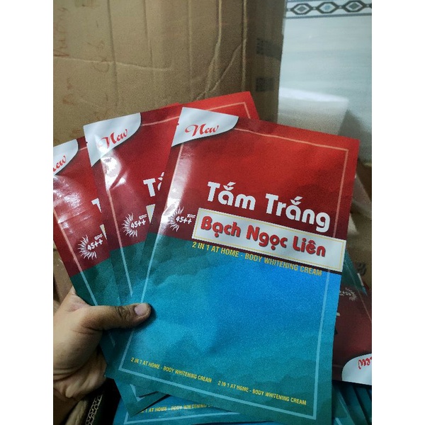 Chuyên Mỹ Phẩm Giá Gốc tại Sài Gòn. Bên shop chuyên hàng thái, hàng công ty , các loại dầu thái và hàng gia công số lượng lớn. Nhận làm hàng gia công nước hoa, kem body trắng da, kích trắng, tắm trắng, ủ sữa non, chống nắng, dưỡng thể, dầu nóng, tẩy tế bào chết xịt bưởi xanh mọc tóc...0.3.4.4.2.2.6.8.2.6... Tắm trắng Bạch Ngọc Liên. Được chiết xuất từ thiên nhiên như tảo biển khoáng chất và các vitamin A B C E đã cho dòng sản phẩm trắng trong vòng 30 phút. Tắm Trắng với công Dụng. hỗn hợp đồng nhất giữa kem và bột có thể bào mòn tẩy tế bào sừng làng làm tăng hắc sắc tố tàn nhang cho da trở nên sáng đẹp mịn màng trẻ trung. Cách dùng. Trộn hỗn hợp đồng nhắc lại với nhau khuấy đều sau đó Thoa toàn cơ thể ủ trong vòng từ 20 đến 30 phút và rửa lại bằng nước sạch.