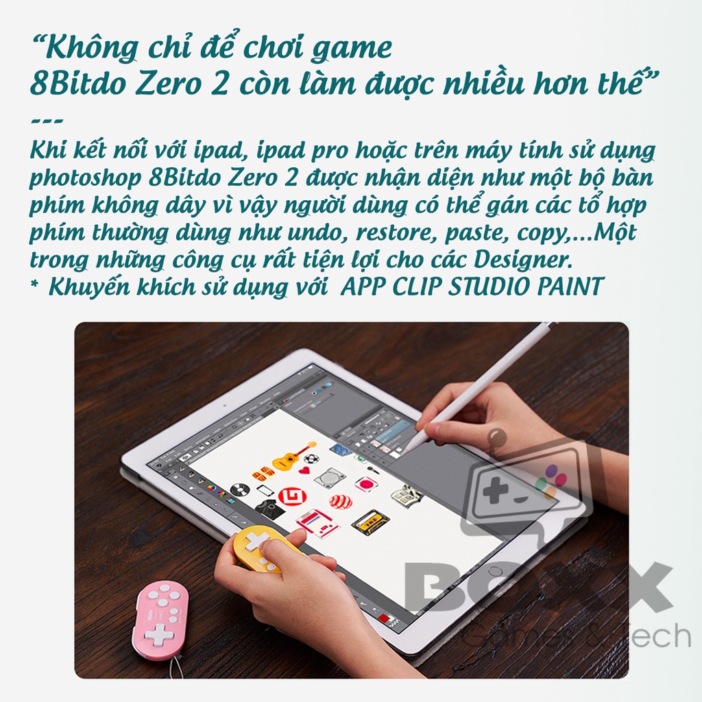 Nếu có một nhà sản xuất phần cứng cho anh em mê game cổ hay game mobile với nhiều đồ chơi độc lạ, thì đó ắt phải là 8BitDo. Sản phẩm mới nhất của họ là chiếc controller tên là Zero 2, có thể kết nối với Nintendo Switch, Điện thoại, Windows và Linux thông qua Bluetooth, nhưng chỉ nhỏ xíu như một chiếc móc chìa khóa anh em dùng hàng ngày. ==================================================================== Đúng như kích thước của một chiếc móc chìa khóa, bạn không nghe lầm đâu ạ. Nhưng 8Bitdo Zero 2 lại mang trong mình đầy đủ những tính năng của một chiếc tay cầm chơi game không dây, kết nối nối qua bluetooth hoặc cắm dây. - Trang bị khả năng kết nối với Nintendo Switch, Windows, Điện thoại mượt mà dễ sử dụng. - Layout phù hợp để chơi những game NES, SNES, RETRO. - Cổng sạc Micro USB cho phép kết nối có dây, cập nhật phần mềm hoặc sạc với nguồn USB. - Thời gian sử dụng từ 5 đến 8 tiếng đủ để mang đi sử dụng bất cứ đâu. - Kích thước siêu nhỏ gọn đi kèm đây đeo độc đáo. - Có thể sử dụng như bộ module bấm cho dân Designer. Bản thân chiếc tay cầm này được tạo ra để chơi những game cổ từ thời “điện tử 4 nút” và “điện tử đĩa mềm” NES và SNES, nên nó không có đủ 4 nút bấm phụ ở cạnh trên, mà chỉ có hai nút như layout tay cầm SNES mà thôi. Các nút bấm cũng theo layout của máy chơi game Nintendo chứ không phải Xbox, nghĩa là vị trí nút A/B và X/Y bị hoán đổi cho nhau. 8Bitdo Zero 2 cực kì phù hợp với những người tay nhỏ, muốn sự gọn nhẹ cũng như độc đáo, có thể mang di bất cứ đâu nhờ kích thước nhỏ gọn. ==================================================================== HƯỚNG DẪN ĐẶT HÀNG : Vì để thuận tiện hơn cho việc lựa chọn sản phẩm nên shop có để nhiều phân loại với tính năng tương tự nhau trên cùng 1 sản phẩm tìm thấy. Nên quý khách vui lòng xem kĩ phân loại gồm ( Màu sắc, Mã Sản phẩm, Kiểu dáng,...) mình đã chọn trước khi đặt hàng để tránh nhầm lẫn ạ. - Trong trường hợp có sai sót hoặc nhầm lẫn khi đặt hàng quý khách vui lòng không bóc seal và đừng vội đánh giá sản phẩm mà hãy liên hệ cho shop trước nhé. Xin cảm ơn. Trọn bộ : - Tay cầm 8Bitdo Zero 2 - Sách hướng dẫn sử dụng. - Cáp dây kết nối. - Móc đeo tay tặng kèm - Sản phẩm bảo hành 6 tháng.