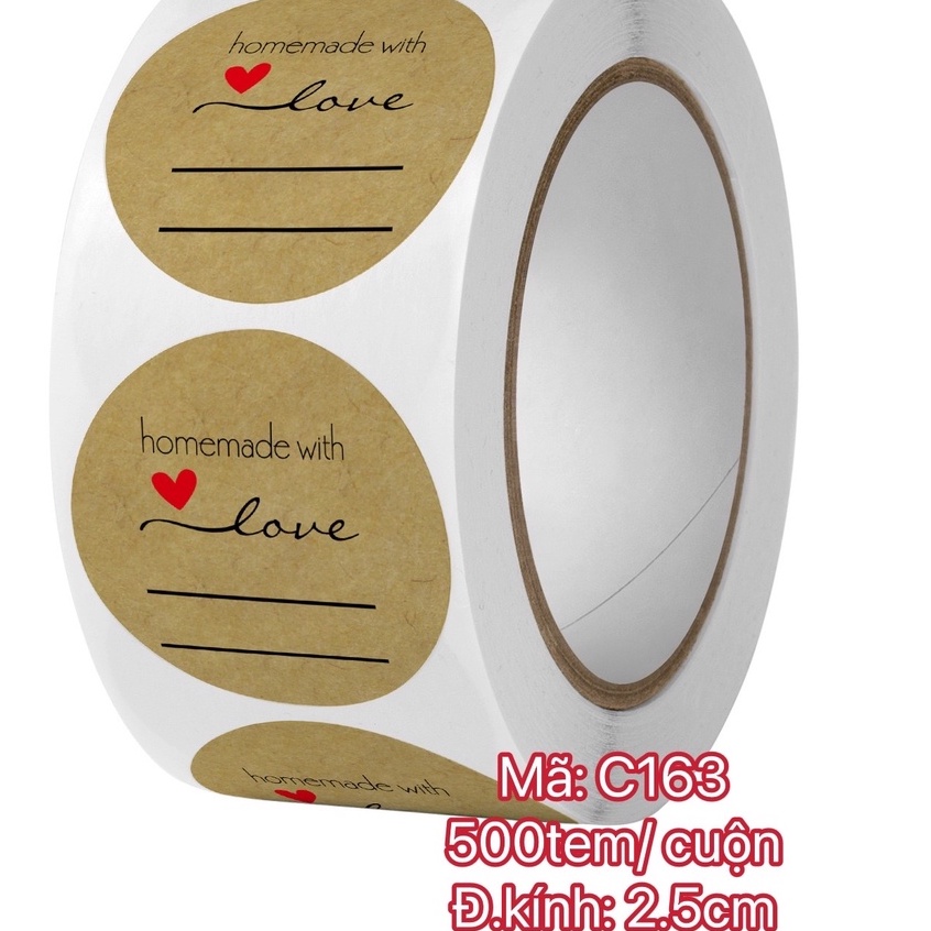 TD08_Tem dán chữ " HANDEMADE WITH LOVE" << SIZE ĐK 2.5CM _ 3.8CM, 500TEM/CUỘN
