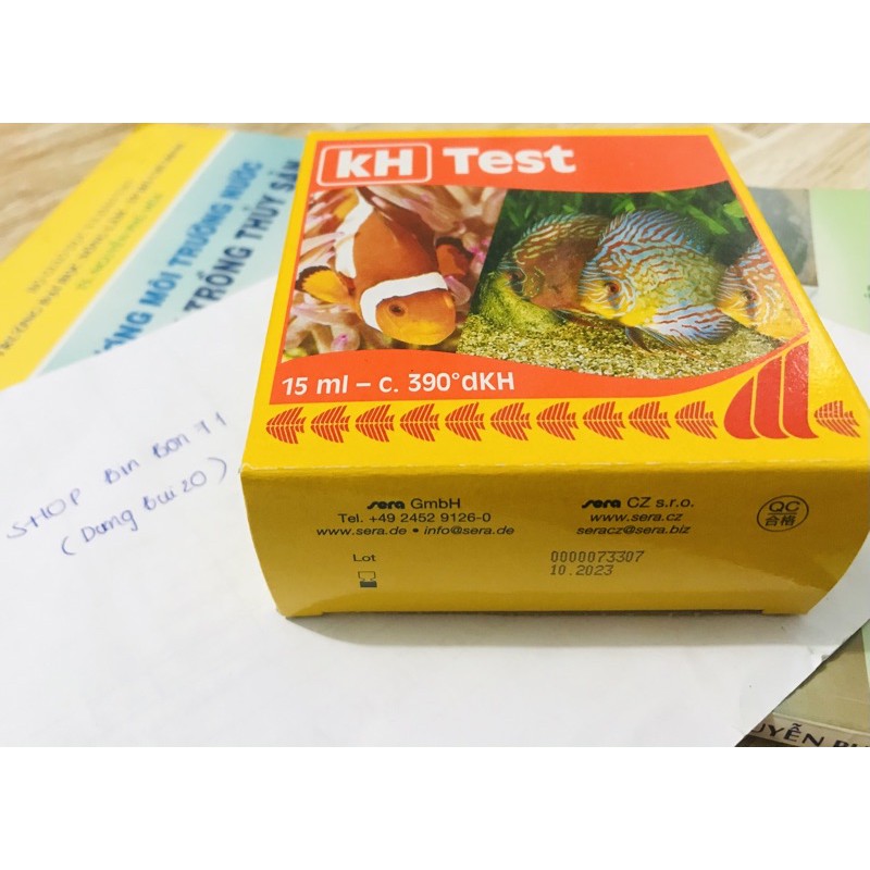 BỘ TEST KIỀM SERA Hãng Sera-Đức Việc kiểm tra độ kiềm của nước giúp kiểm tra khả năng trung hòa axit và ngăn pH thay đổi đột ngột có thể gây ra các vấn đề sức khỏe cho tôm cá. Test kiềm sera được xem là cách đo độ kiềm đơn giản với chi phí thấp cho người dùng. * BỘ TEST KIỀM (KH) SERA cung cấp gồm: - 1 chai thuốc thử 15ml - 1 ống test mẫu - Hướng dẫn sử dụng - Hộp đựng * Cách đo độ kiềm trong nước với BỘ TEST KIỀM (KH) SERA: Bước 1: Rửa ống test vài lần với mẫu test. Và cho nước mẫu vào ống test đến vạch 5ml. Lau khô phía ngoài ống test. Bước 2: Nhỏ từng giọt thuốc thử vào ống test, lắc nhẹ sau mỗi lần nhỏ và nhỏ đến khi dung dịch chuyển từ màu xanh da trời sang xanh lá và chuyển sang màu vàng. Bước 3: Đọc kết quả: - Hàm lượng CaCO3 (mg/l)= số giọt x 17.9 - Hàm lượng HCO3 (mg/l)= số giọt x 21.8 * Những lưu ý khi dùng và bảo quản BỘ TEST KIỀM (KH) SERA ! Rửa ống test vài lần với nước máy trước và sau khi sử dụng. ! Đóng nắp thuốc thử ngay sau khi sử dụng và bảo quản ở nhiệt độ phòng tránh ánh sáng trực tiếp. ! Tránh không cho thuốc thử bắn vào mắt và để xa tầm tay trẻ em Liên hệ: 0334924079 (zalo/điện thoại) để được tư vấn thêm về sản phẩm. khách mua sỉ liên hệ sdt em ạ.
