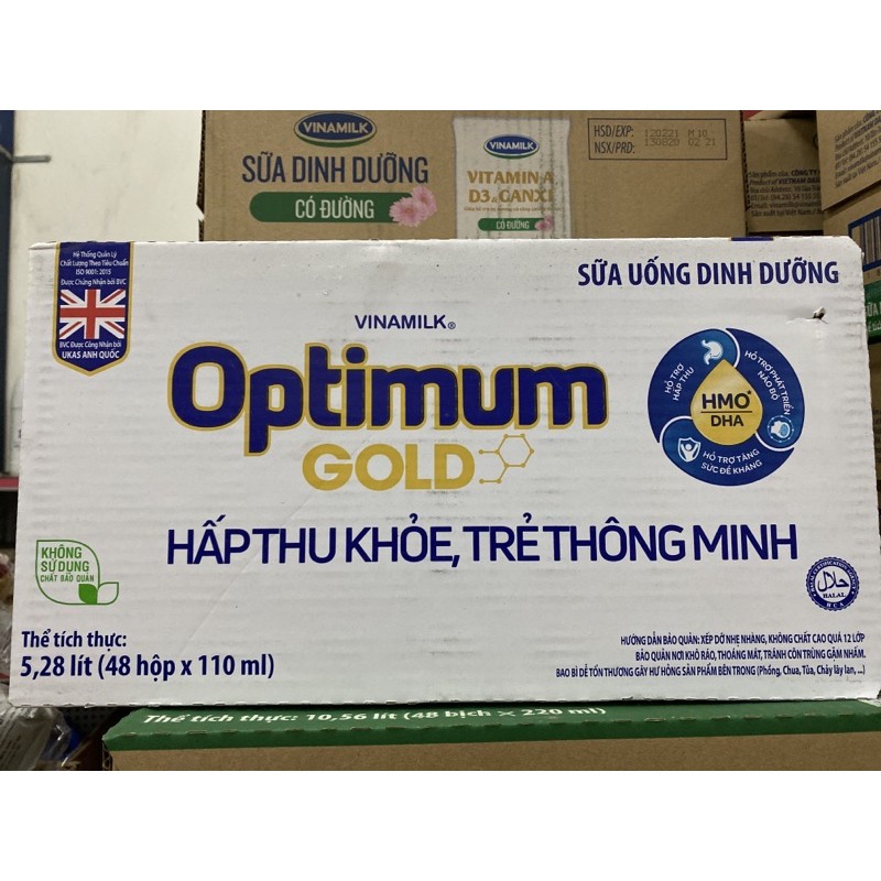 Thông tin Thùng sữa bột pha sẵn Optimum Gold 110ml (48 hộp) Thương hiệuCông ty CP Sữa Việt Nam Vinamilk Độ tuổi Trên 1 tuổi Dung tích 48 hộp x 110ml Thành phần dinh dưỡng Trong 100ml Năng lượng 77 kcal Chất đạm 2.8 g Cholin 24 mg Chất béo 3 g Chất bột đườn