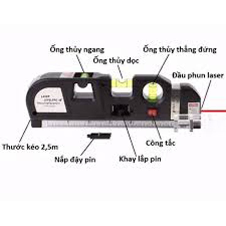Thước đo laser đa chức năng: ni vô nằm, đứng, xiên 45 °, thước rút 2.5m, thước ngắn 15cm, laser đo cân bằng ngang. Có công tắc thay đổi chế độ tia Laser ngang, dọc, và 2 tia cắt vuông góc hết sức tiện lợi. Nhanh chóng, chính xác. Nhỏ gọn, dễ mang theo mọi lúc mọi nơi. Thước Đo Bằng Laser 2 tia dọc - ngang , ngoài ra còn có thước kéo dùng làm thước đo khoảng cách Thước đo laser dễ dàng lấy các điểm thẳng hàng hoặc đánh dấu các vị trí sao cho thẳng hàng.