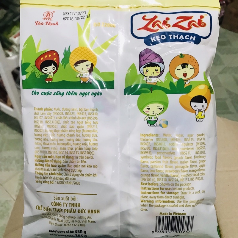 [Hàng Chuẩn] Kẹo Thạch Zaizai Đức Hạnh Túi 350g Nhiều Hương Vị Trái Cây Thơm Ngon - MekutiShop - Thạch Zaizai là sản phẩm của Công ty Đức Hạnh, là đơn vị có uy tín trong thị trường bánh kẹo trong nước. Sản phẩm được bán rộng rãi trên thị trường, trong chuỗi siêu thị BigC, Aeon,Vinmart...và hàng nghìn đại lí trên cả nước. - Thạch có vị ngọt nhẹ, giòn, dai, nhiều hương vị trái cây như: dứa, xoài, dâu tây, cam, nho... - Được đóng gói chắc chắn, đẹp mắt với các hình ảnh ngộ nghĩnh, nhiều gói nhỏ thích hợp làm đồ ăn vặt cho trẻ em cũng như các dịp sinh nhật lễ tết. Thạch được sản xuất theo hình dạng mỏng dẹt. vị giòn mềm vừa phải, trẻ con dễ cắn dễ nuốt không sợ bị hóc, rất an toàn. Sản phẩm ăn sẽ ngon hơn khi được để lạnh. Thành phần gồm: nước ,đường kính, fructoza ,bột làm thạch, vani... và các hương vị trái cây. Hạn sử dụng: 12 tháng kể từ ngày sản xuất. Shop Mekuti bán cả offline nên hàng cập nhật liên tục, cam kết bán hàng mới, hạn sử dụng rất dài. #thachzaizai #keothachzaizai #thachduchanh