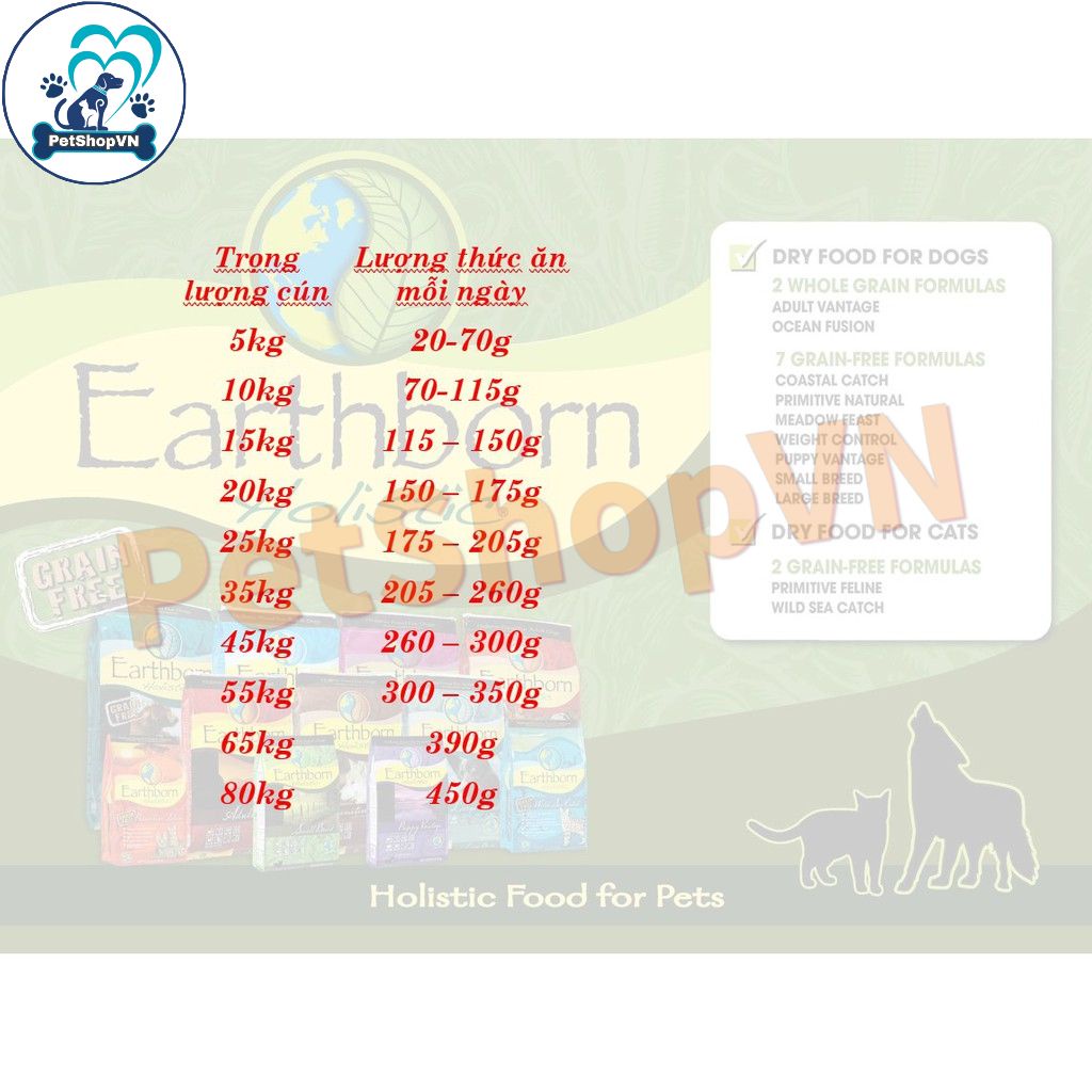 Thức ăn hạt EARTHBORN HOLISTIC PRIMITIVE NATURAL dành cho TẤT CẢ GIỐNG CHÓ ở mọi GIAI ĐOẠN PHÁT TRIỂN. Thức ăn hạt EARTHBORN HOLISTIC PRIMITIVE NATURAL là sản phẩm dinh dưỡng không ngũ cốc thay thế tiên tiến. Sản phẩm được chế biến từ các thành phần lành mạnh, bổ dưỡ