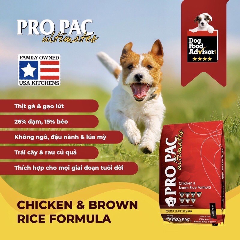 Thức ăn cho chó Pro Pac Ultimates Chicken Meal & Brown Rice được chế biến không có ngô, lúa mì hoặc đậu nành. Cung cấp dinh dưỡng tối ưu trong dinh dưỡng chó. Bột gà chất lượng cao được sử dụng làm nguồn protein duy nhất để cung cấp các axit amin thiết yếu giúp duy tr