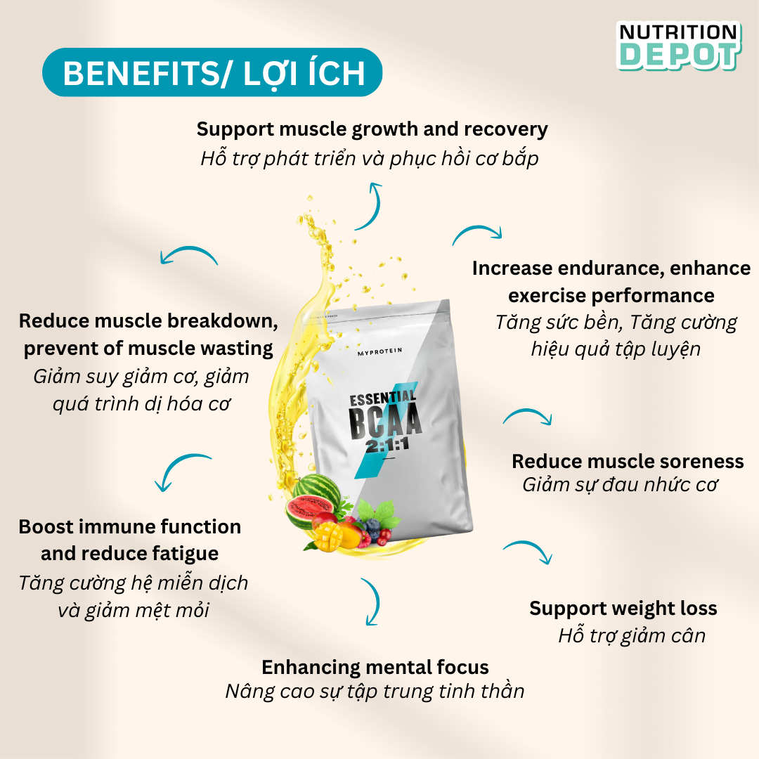 ĐIỂM NỔI BẬT CỦA SẢN PHẨMSản phẩm Myprotein Essential BCAA có chứa Branched Chain Amino Acids là những axit amin thiết yếu được tổng hợp theo tỷ lệ 2:1:1 gồm Leucine, Isoleucine và Valine. Những axi...