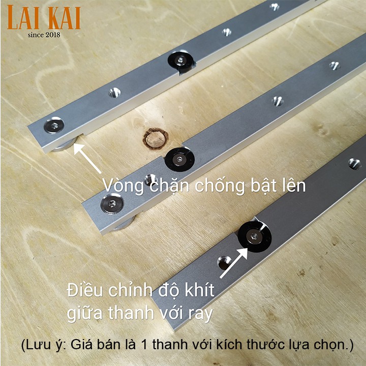 Chất liệu : Nhôm Kích thước: Gồm các loại thanh tiết diện vuông hoặc chữ T như sau: - Thanh trượt vuông dài 300mm không vòng chặn. - Thanh trượt vuông dài 300mm có vòng chặn. - Thanh trượt vuông dài 450mm có vòng chặn. - Thanh trượt chữ T dài 300mm không lỗ. - Thanh trượt chữ T dài 300mm có 5 lỗ M6 và 6 lỗ M8. - Thanh trượt T dài 450mm không lỗ. - Thanh trượt T dài 450mm có 8 lỗ M6 và 9 lỗ M8. • Ứng dụng: Dùng chung với ray trượt nhôm tạo thành hệ thống trượt để chế bàn thao tác làm mộc, cưa bàn, phay bàn... (sản phẩm không bao gồm ray trượt)
