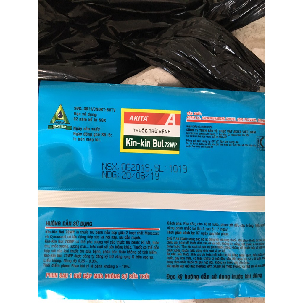 thuốc trị nấm Kin Kin Bul gói 45 gr KIN KIN BUL 72WP gói 100g là chế phẩm trừ bệnh hỗn hợp giữa 2 hoạt chất Macozeb và Cymoxanil có tác động tiếp xúc nội hấp và lưu dẫn mạnh. Có thể pha chung với cac thống trừ bệnh rỉ sắt, thối cuống, rụng trái ( thán thư) trên cà phê, điều. Vàng lá, loét mặt trên cao su và các bệnh sương mai. Thán thư, đốm nâu trên 1 số cây trồng