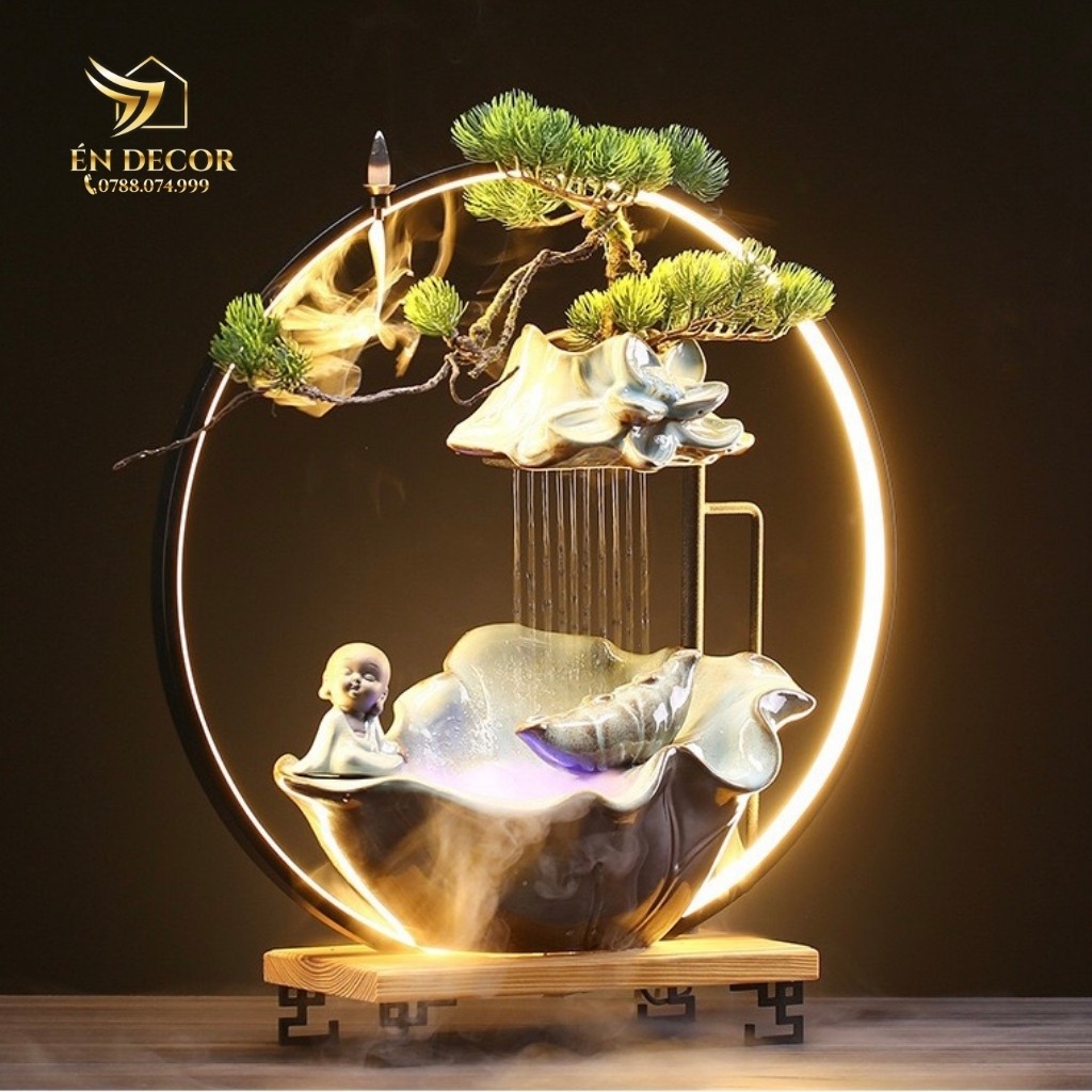 Tiểu Cảnh Thác Nước, Có Đèn Led, Đốt Hương Trầm, Chú Tiểu An Nhiên, Én Decor