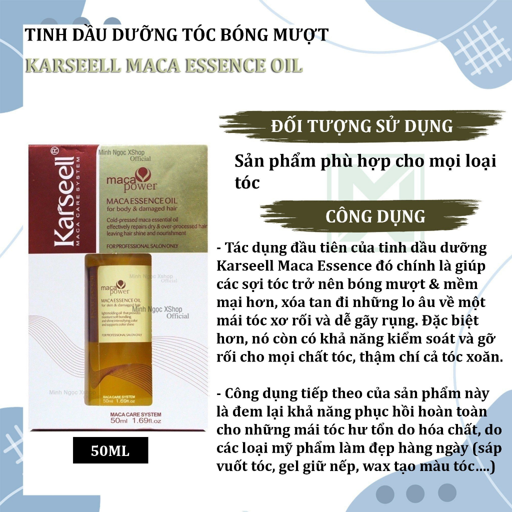 Dầu dưỡng tóc phục hồi Karseell Maca Eseence Oil 50ml chính hãng Tổng quan: Tinh dầu dưỡng Karseell Maca Essence giúp các sợi tóc trở nên bóng mượt & mềm mại hơn, xóa tan đi những lo âu về một mái tóc xơ rối và dễ gãy rụng. Đặc biệt hơn, nó còn có khả năng kiểm soát