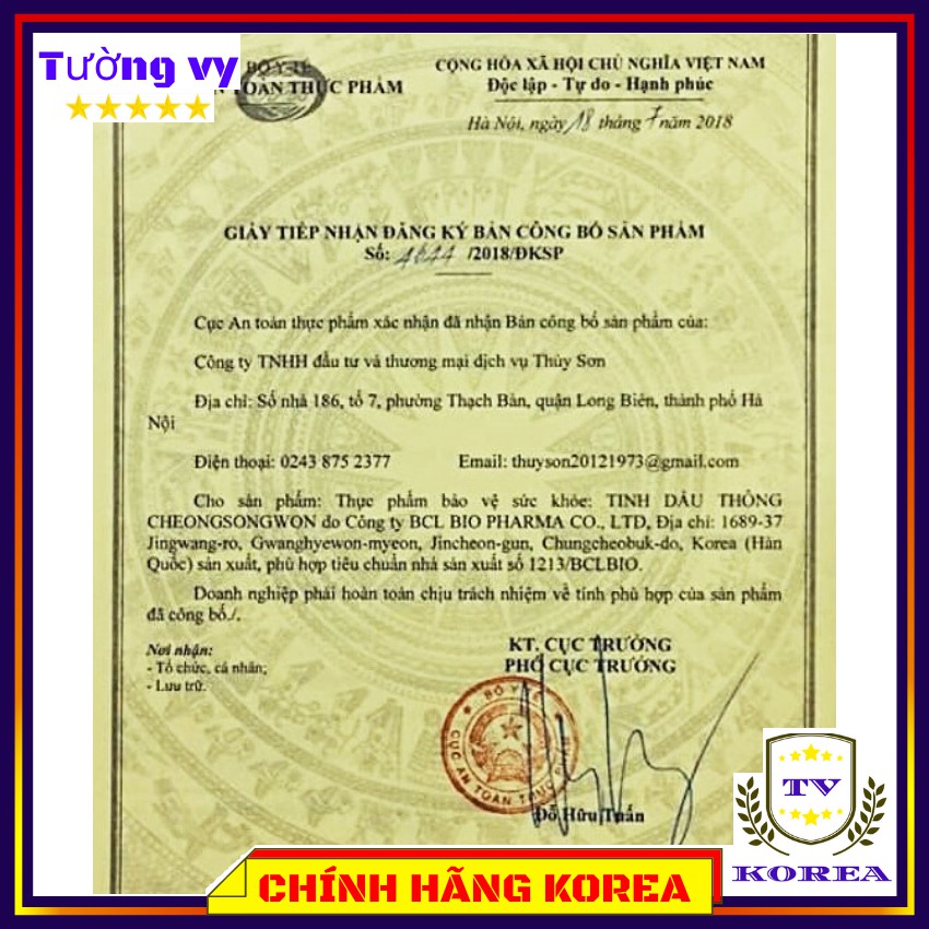Cam Kết - Hàng Chính Hãng, Giá Cạnh Tranh Nhất - Hoàn Tiền 100% Nếu SP Ko Đúng Mô Tả ---------------------------------------------------------------- Tinh Dầu Thông Đỏ Hàn Quốc Cheongsongwon Xuất xứ : Korea Hàn Quốc Quy cách : Hộp 18 vỉ x 10 viên Tinh dầu thông đo