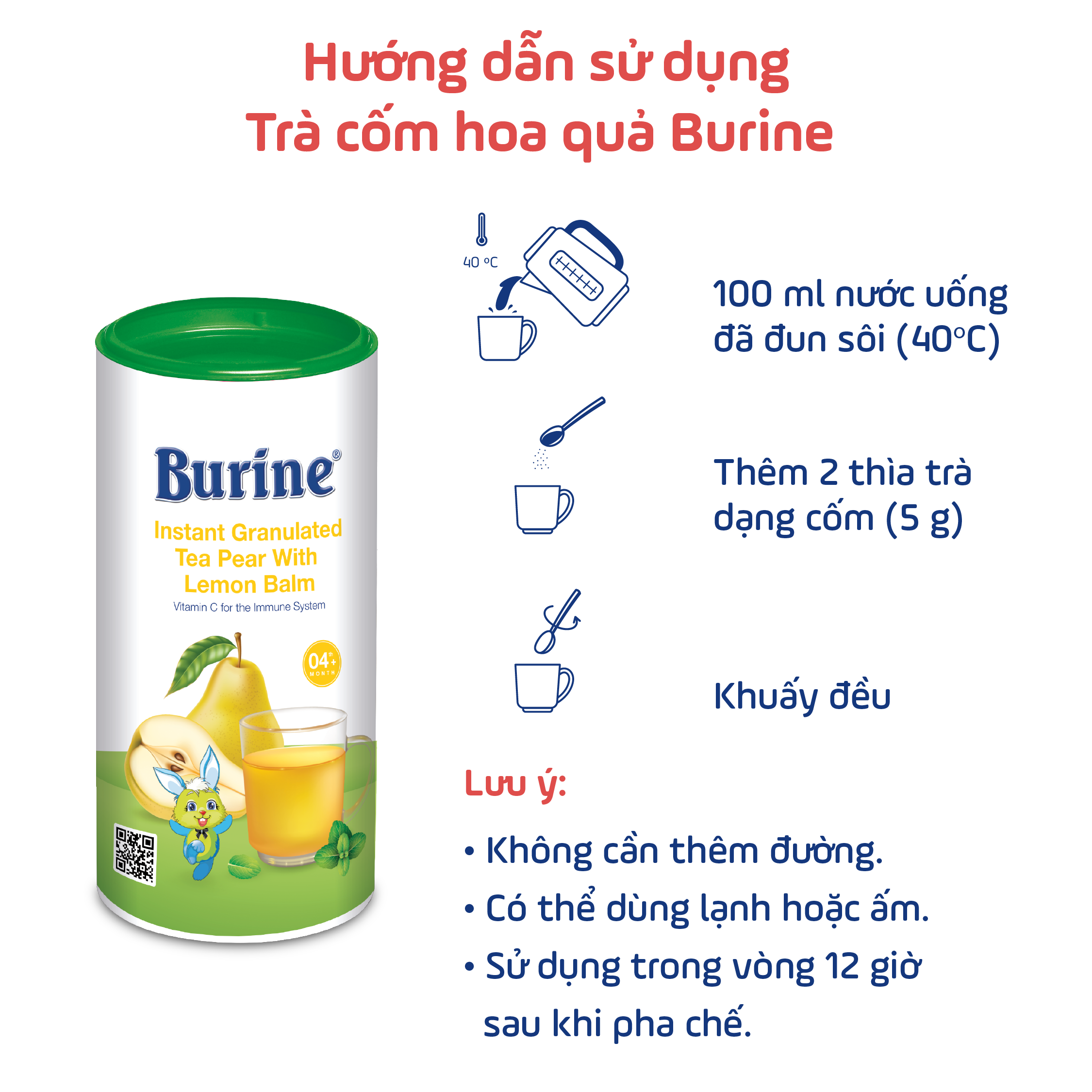 TRÀ CỐM HOA QUẢ BURINE HOA LÊ BẠC HÀ Trà cốm hoa quả Burine Lê Bạc hà là dòng sản phẩm trà giải khát giàu vitamin C, tăng cường sức đề kháng cho cả gia đình, không dùng cho bé dưới 4 tháng tuổi. Sản phẩm dạng cốm hòa tan trong nước nhanh chóng, dễ pha chế, hương vị tự nhiên đạt tiêu chuẩn EU. Thông tin sản phẩm: Giá bán: 155.000đ Thành phần: Glucose, maltodextrin, chiết xuất bạc hà 1,25%, bột lê 0,85%, hương lê tự nhiên, vitamin C. Công dụng: Giảm ho, đau họng Hỗ trợ giảm các triệu chứng đau răng, đầy bụng… Giảm tình trạng táo bón ở trẻ. Ưu điểm nổi bật: Không chứa GMO, không chứa gluten, không chất bảo quản, không chất tạo màu nhân tạo. Đóng gói/ bao bì: Hạn sử dụng: 24 tháng kể từ ngày sản xuất Hướng dẫn sử dụng: Phù hợp với mọi lứa tuổi, Không dùng cho trẻ dưới 4 tháng tuổi Pha 100 ml nước uống đã đun sôi (40° C), thêm 2 thìa trà dạng cốm (5g) và khuấy đều. Không cần thêm đường. Có thể sử dụng lạnh hoặc ấm. Lưu ý: Sử dụng trong vòng 12 giờ sau khi pha chế. Cách bảo quản sản phẩm: Bảo quản nơi khô ráo dưới 25 độ C, độ ẩm dưới 65% Luôn đậy kín nắp và để ở nơi khô ráo và không để trực tiếp dưới ánh nắng mặt trời. Xuất xứ: Cộng Hòa Séc.Giá sản phẩm trên Tiki đã bao gồm thuế theo luật hiện hành. Bên cạnh đó, tuỳ vào loại sản phẩm, hình thức và địa chỉ giao hàng mà có thể phát sinh thêm chi phí khác như phí vận chuyển, phụ phí hàng cồng kềnh, thuế nhập khẩu (đối với đơn hàng giao từ nước ngoài có giá trị trên 1 triệu đồng).....