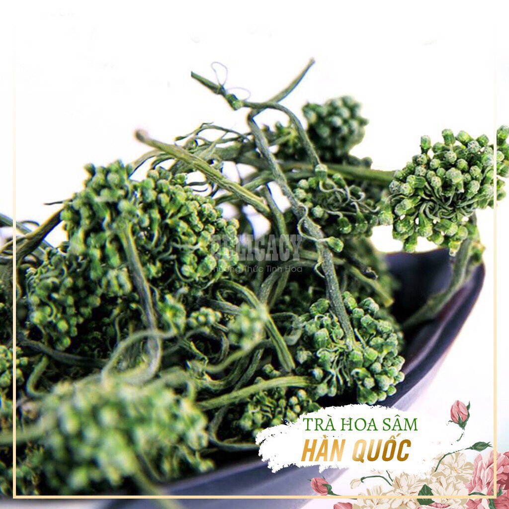 Trà Hoa Nhân Sâm Hàn Quốc Xuất xứ : Hàn Quốc Quy cách : Túi 500gr Nhân sâm Hàn Quốc sau khi trồng 4 tháng tuổi sẽ ra hoa, sau khi hái được rửa sạch, hấp cách thủy rồi được phơi khô dưới ánh nắng mặt trời, sau đó sao khô thêm 1 lần nữa sẽ tạo thành Trà Hoa Nhân Sâm.