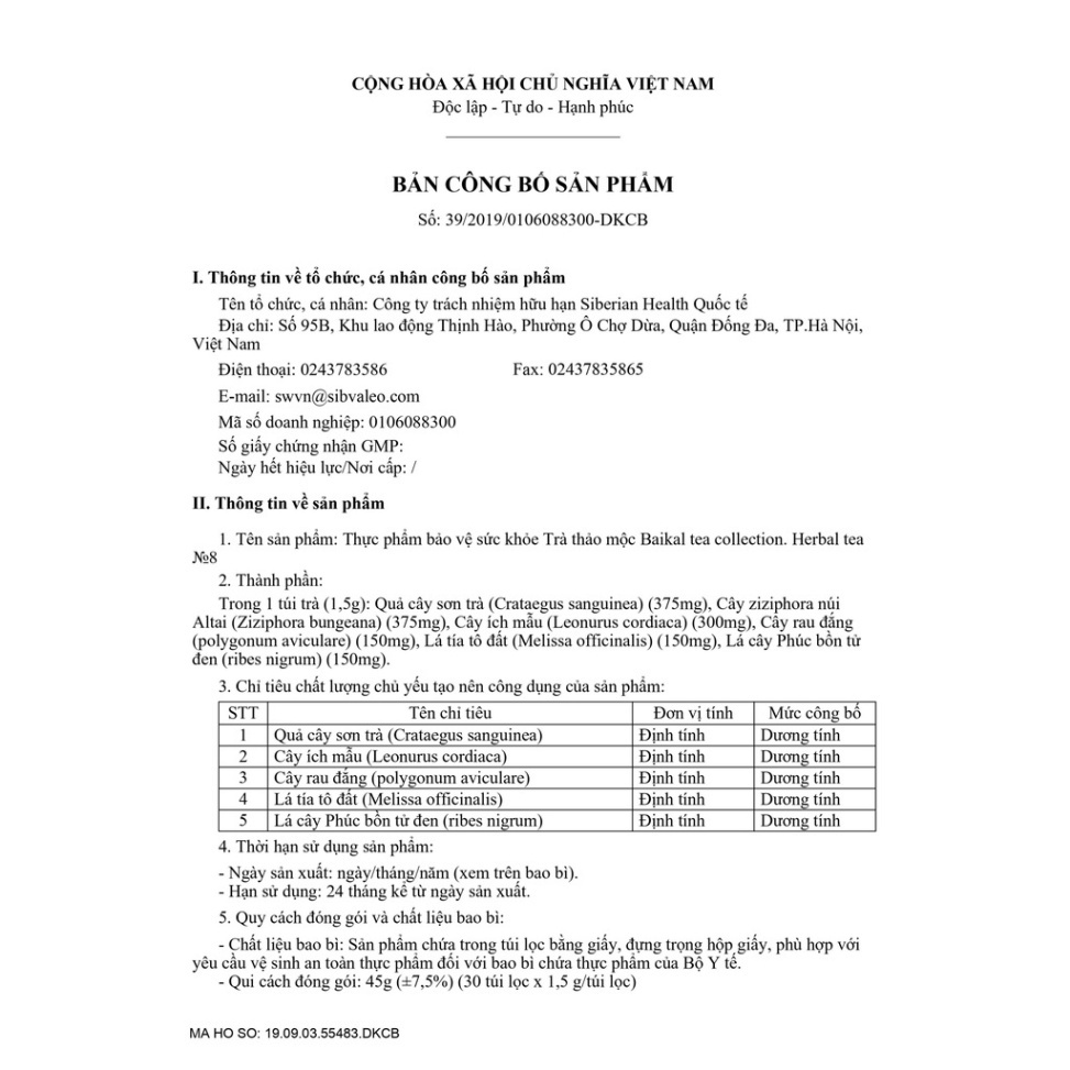 Trà thảo mộc Baikal tea collection - Herbal tea N8 – Trà tim mạch – 30 túi – Date T11/2022 Thành phần: Trong 1 túi trà (1,5g): Quả cây sơn tra (Crataegus sanguinea) (375mg), Cây ziziphora núi Altai (Ziziphora bungeana) (375mg), Cây ích mẫu (Leonurus cordiaca) (300mg), Cây rau đắng (polygonum aviculare) (150mg), Lá tía tô đất (Melissa officinalis) (150mg), Lá cây Phúc bồn tử đen (ribes nigrum) (150mg). Công dụng: Trà thảo mộc Baikal tea collection. Herbal tea N8 hỗ trợ trái tim của bạn với các loại thảo dược từ Siberia: lá cây phúc bồn tử đen, quả cây sơn tra, lá tía tô đất và cây ích mẫu, hỗ trợ giúp tăng cường lưu thông khí huyết, tốt cho tim mạch. Cách sử dụng: - Cho 1 gói trà vào một cốc nước sôi (200ml) trong 10-15 phút. Ngày dùng 3 gói, mỗi bữa ăn dùng 01 gói. Đối tượng sử dụng: Người lớn. Xuất xứ: Liên Bang Nga Bảo quản: Nơi khô ráo, tránh ánh sáng, nhiệt độ không quá 25°C, tránh xa tầm tay trẻ em. Hạn sử dụng: T11/2022 Thương nhân nhập khẩu và chịu trách nhiệm về chất lượng sản phẩm: CÔNG TY TNHH SIBERIAN HEALTH QUỐC TẾ Sản phẩm này không phải là thuốc và không có tác dụng thay thế thuốc chữa bệnh HÃY INBOX NGAY CHO CHÚNG TÔI ĐỂ SỞ HỮU SẢN PHẨM CHĂM SÓC SỨC KHỎE TỐT NHẤT, DÀNH TẶNG NHỮNG NGƯỜI THÂN YÊU CỦA MÌNH NHÉ ! QUYỀN LỢI CỦA KHÁCH HÀNG khi mua hàng chính hãng tại shop • Bảo hành trọn đời chất lượng sản phẩm, hỗ trợ đổi trả miễn phí trong 7 ngày (theo chính sách của Shopee) • Chất lượng sản phẩm được kiểm định kĩ lưỡng trước khi gửi cho Quý khách • Tư vấn hỗ trợ 24/24 giải đáp mọi thắc mắc khi khách hàng gọi vào số hotline hoặc nhắn tin cho Shop • Ấn FOLLOW shop để nhận nhiều ưu đãi ☎️ Hotline Tư Vấn : Zalo : 0395.796.387 . Shop cam kết : 1. 100% sản phẩm chính hãng 2. Giao COD toàn quốc. 3. Đổi trả theo quy định của Shopee. #tràsiberian #trà_siberian #trasiberian #tra_siberian #tràbaikalnga #trà_baikal_nga #trabaikalnga #tra_baikal_nga LIÊN HỆ SHOP THEO SĐT 0395.796.387