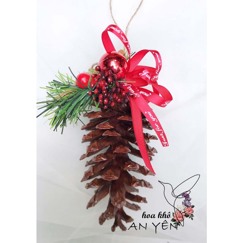 Trái thông lớn 20cm được shop set lại với nhiều mẫu mã xinh xẻo, phù hợp treo 1 mình hoặc treo trên cây thông trang trí.