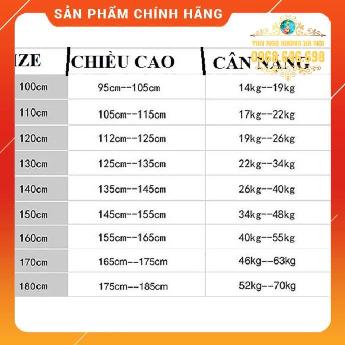 TRANG PHỤC TÔN NGỘ KHÔNG TRẺ EM TỀ THIÊN ĐẠI THÁNH Tôn Ngộ Không là nhân vật mà các bé vô cùng yêu thích, thật tuyệt vời khi giờ đây bé có thể hóa trang thành thần tượng của mình Bộ trang phục Tôn ngộ không rất hoành tráng, có 2 sợi râu trên đầu y như ở hoa quả sơn Bộ trang phục gồm có: - quần áo, áo choàng, giáp cổ, bao tay, mặt nạ , mũ , 2 sợi râu dài, vòng kim cô, giày, gây như ý. CHỀU CAO SIZE CỦA TRẺ EM TỪ 100CM-160CM ( BẢNG CHỌN SIZE ĐÍNH KÈM PHÍA DƯỚI ) Cách chọn size như sau size 100: cao từ 95cm-105cm nặng từ 14kg-19kg size 110: cao từ 105cm-115cm nặng từ 17kg- 22kg size 120: cao từ 112cm- 125cm nặng từ 19kg- 26kg size 130: cao từ 125cm-135cm nặng từ 22kg- 34kg size 140: cao từ 135cm -145cm nặng từ 26kg - 40kg size 150: cao từ 145cm- 155cm nặng từ 34kg - 48kg size 160: cao từ 155cm- 165cm nặng từ 40kg - 55kg Tại sao nên mua hàng của shop chúng tôi TÔn Ngộ Không Hà Nội - chúng tôi là shop trang phục biểu diễn , hóa trang hàng đầu Việt Nam - Chúng tôi có đầy đủ mẫu mã trang phục, size giày, size quần áo đều đầy đủ - Chúng tôi là đơn vị tổ chức rất nhiều sự kiện kết nối cộng đồng các bạn đam mê tôn ngộ không Bộ TRANG PHỤC TÔN NGỘ KHÔNG do ảo thuật gia David Hải tuyển chọn hàng chất lượng cao , giá rẻ, phù hợp để biểu diễn ảo thuật, hóa trang, hoạt náo, diễn kịch, làm youtube.... Chúng tôi CAM KẾT hàng chuẩn đẹp y như trong ảnh. Ảnh thật chụp 100% tại shop, ảnh của khách hàng gửi Chúng tôi tư vấn, hướng dẫn quý khách mặc đồ hoàn toàn mien phi. Quý vị phụ huynh muốn mua tặng cho con mình một món quà ý . Bộ trang phục Tôn Ngộ Không là một gợi ý quá tuyệt vời. Các bé sẽ rất vui khi được hóa thân thành thần tượng Tôn Ngộ Không. Hàng có đủ mọi size cho các bé từ 100cm-160cm p/s; ảnh khách hàng của shop gửi phản hồi ! #tonngokhonghanoi - Nơi chắp cánh ước mơ