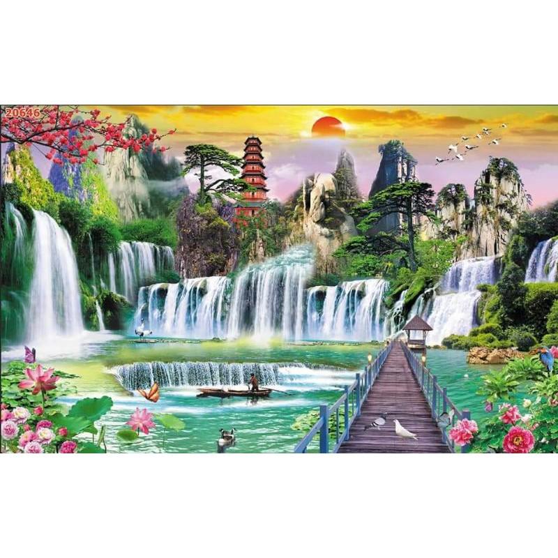 Tranh dán tường 3D sơn thủy hữu tình , phong cảnh, thác nước nhận in theo kích thước yêu cầu