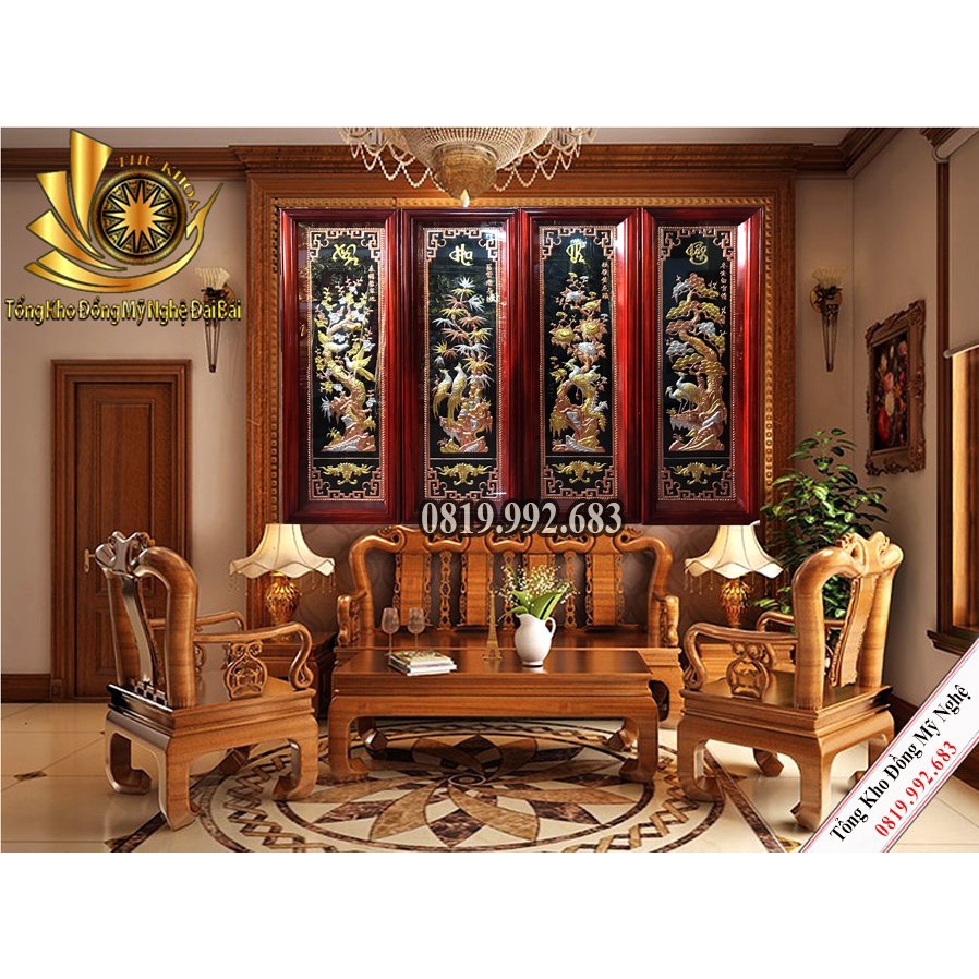 Tranh Tứ Quý Bằng Đồng Mạ Vàng 24K Kèm Đèn Led Gỗ Thịt Chính Hãng Đồ Đồng Đại Bái Bộ Kích Thước Chuẩn Phong Thủy