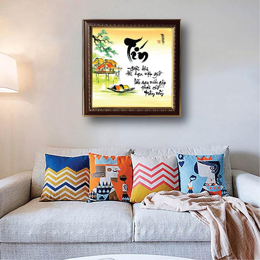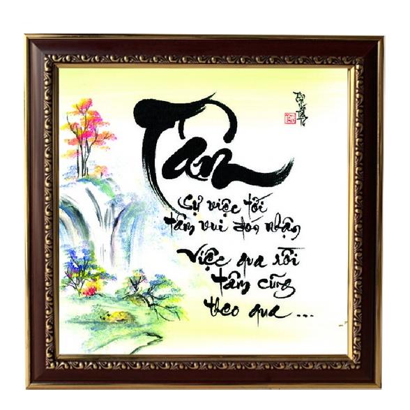 MÔ TẢ SẢN PHẨM: (TẶNG ĐINH 3 CHÂN TREO TƯỜNG) * Tranh thư pháp từ lâu đã trở thành nét đẹp của văn hóa Việt, những bức tranh với hình ảnh và câu từ đầy ý nghĩa sẽ là món quà tặng tinh thần cho bản thân và những người yêu thương ============================================================== KÍCH THƯỚC: 36x36cm, 51x51cm (KHUNG VIỀN) CHẤT LIỆU: CANVAS CĂNG KHUNG, có khung bao bên ngoài, KHÔNG KIẾNG, tranh canvas có bề mặt chống thấm, dễ dàng làm sạch bằng chổi lông gà hoặc khăn ẩm - Khung căng canvas làm từ gỗ tự nhiên chắc chắn, khung ngoài nhẹ, đẹp, đảm bảo thẩm mỹ ============================================================== - CAM KẾT CỦA CHÚNG TÔI: • Tranh đẹp sắc nét , chất lượng sản phẩm tốt nhất, giữ màu sắc trên 5 năm • Đổi trả hàng, hoàn tiền nếu hàng không đúng mô tả, hàng bị lỗi • Sẵn sàng tư vấn hỗ trợ khách hàng tất cả những gì có thể . ============================================================== Shop THẾ GIỚI TRANH ĐẸP Giao hàng toàn quốc Giá sản phẩm trên Tiki đã bao gồm thuế theo luật hiện hành. Bên cạnh đó, tuỳ vào loại sản phẩm, hình thức và địa chỉ giao hàng mà có thể phát sinh thêm chi phí khác như phí vận chuyển, phụ phí hàng cồng kềnh, thuế nhập khẩu (đối với đơn hàng giao từ nước ngoài có giá trị trên 1 triệu đồng).....