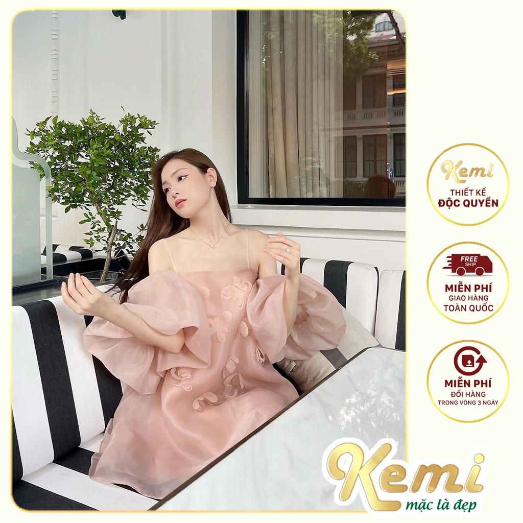 Váy 2 dây tơ hồng đính hoa tay phồng rớt vai Kemi dáng tiểu thư sẵn 3 màu mới
