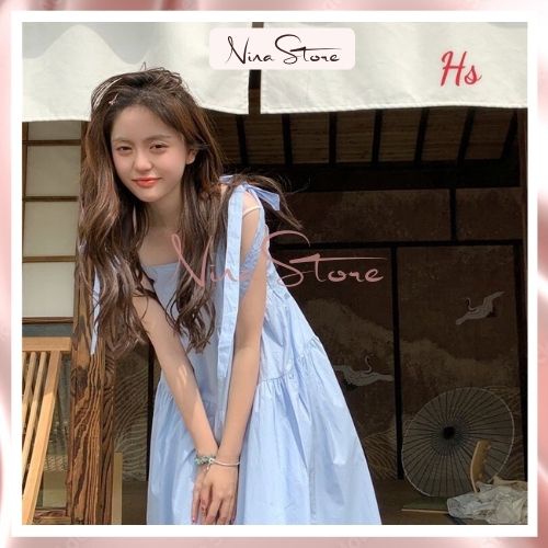 Váy babydoll nữ dáng dài đầm nữ 2 dây buộc nơ vai 2 màu trắng xanh style tiểu thư hàn quốc nhẹ nhàng nữ tính NinaStore