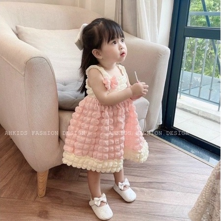 Váy cho bé gái xốp hồng 2 dây đính nơ 8-22kg
