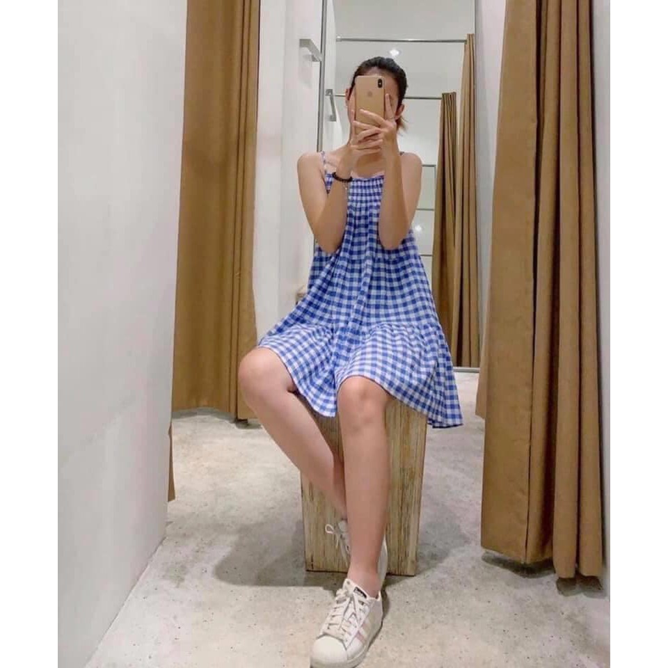 Váy hai dây kẻ caro xanh dáng babydoll phong cách tiểu thư thời trang nữ