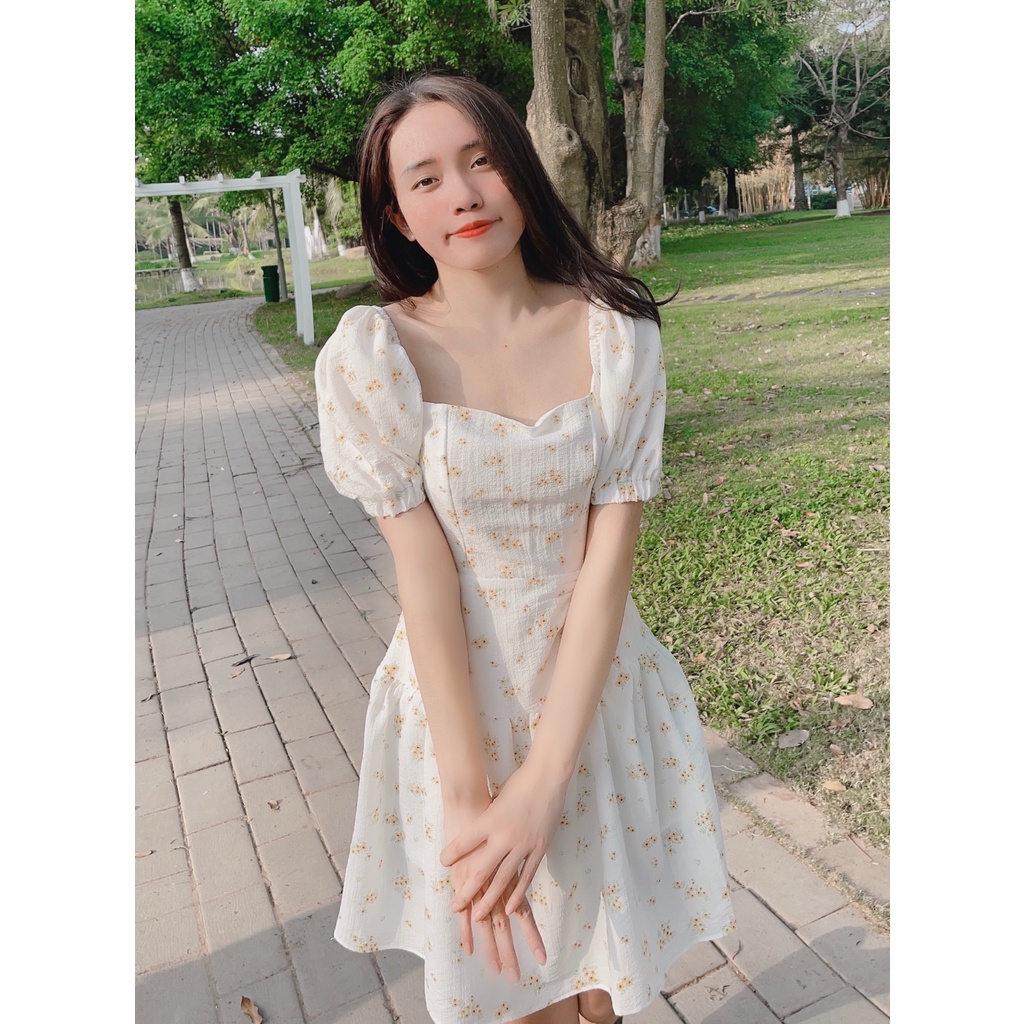 Váy Hoa Cổ Vuông Dáng Xòe Nhún Bèo HT27 HaLuu Store Đũi Xốp Phù Hợp Cho Nữ