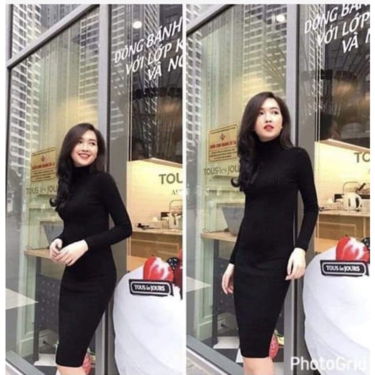Váy len body suông trơn cổ lọ Đầm chất len dài tay thanh lịch