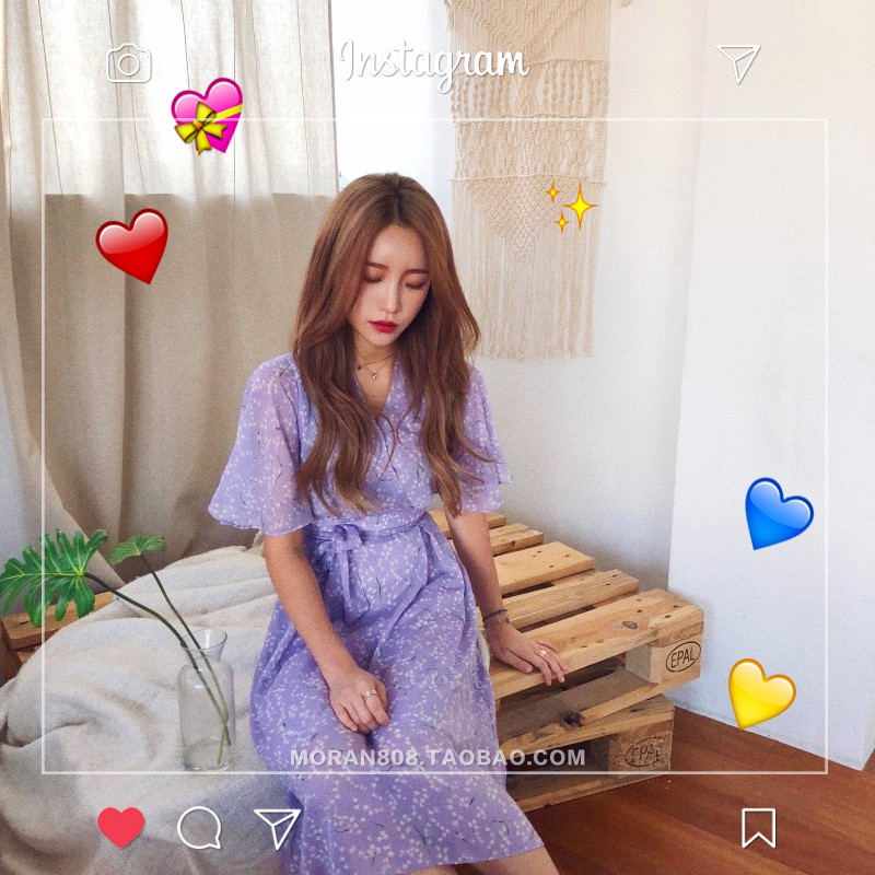 Váy MORAN voan xòe dài cổ V hoa tím thắt nơ eo nhẹ nhàng Vintage Hàn Quốc mùa hè mới 2020