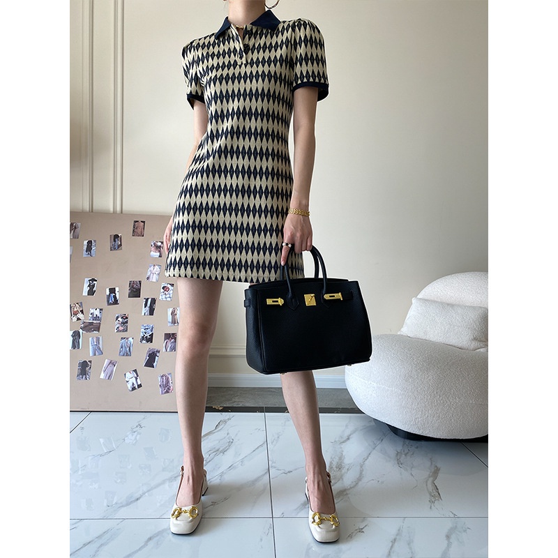 Váy nữ họa tiết hình thoi cổ phối với chất liệu thun mềm mát tay siêu dễ thương