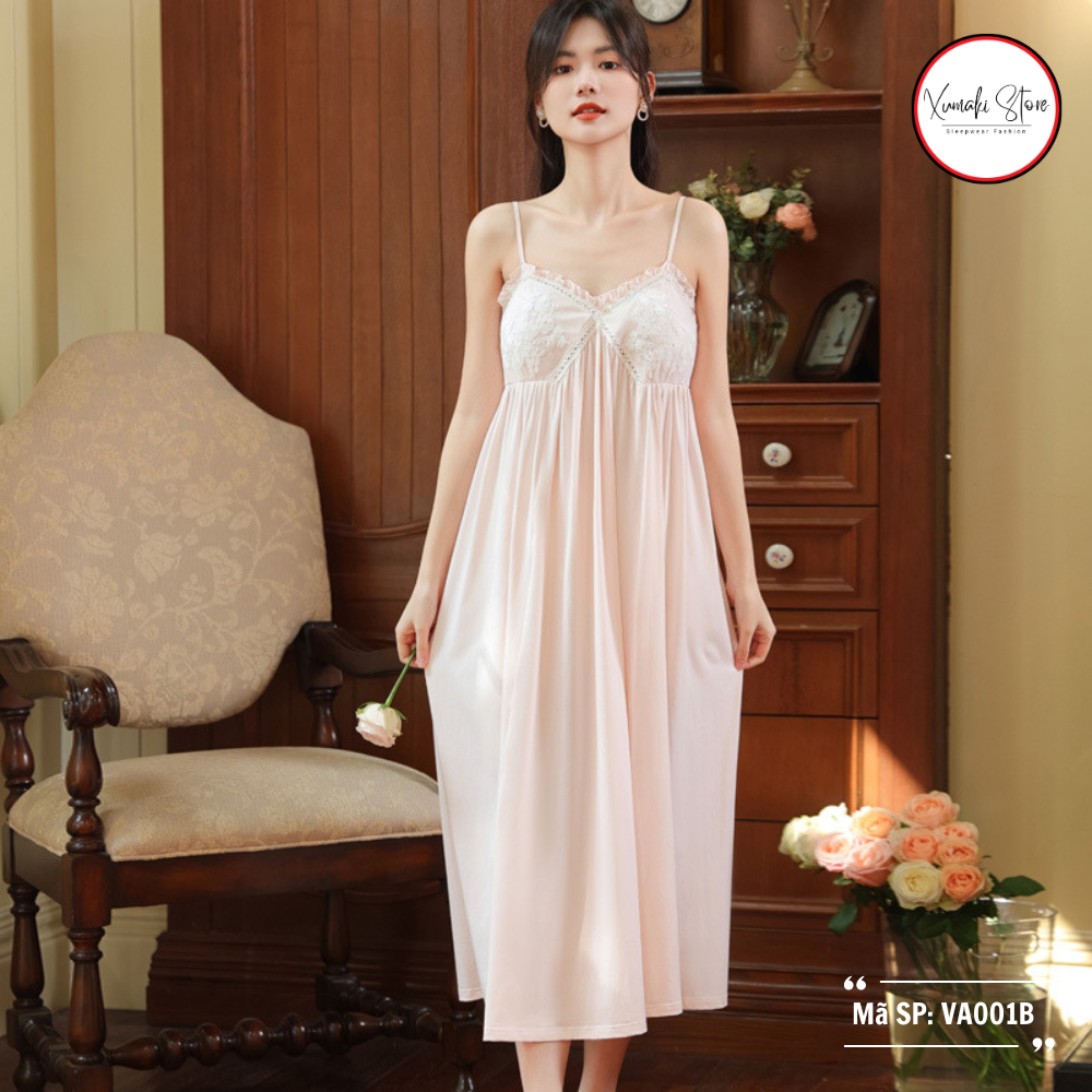 Váy ngủ 2 dây nữ họa tiết thêu ngực chất cotton cao cấp dáng dài Xumaki Store VA001B