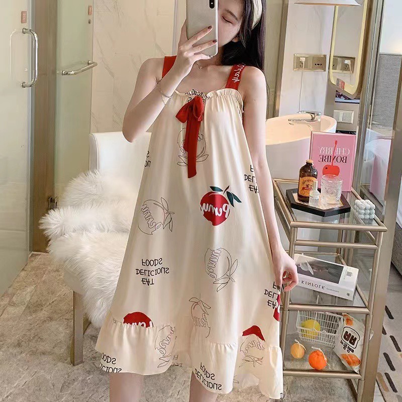 Váy Ngủ Nữ 2 Dây Đính Nơ Họa Tiết In Cute Chất Thun Sữa - Hàng Quảng Châu Cao Cấp