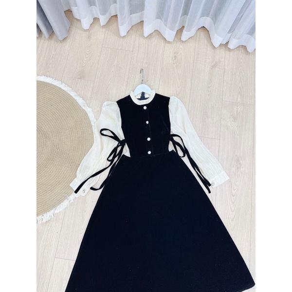 Váy nhung cổ bèo phối đính nơ eo hai bên