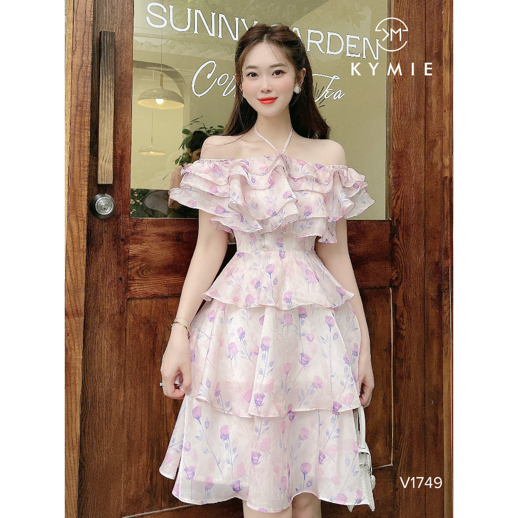 Váy tơ hoa trễ vai 3 tầng bèo ngực V1749 Kymie