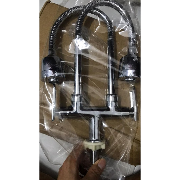 Vòi rửa chén đôi, vòi rửa chén bát dùng cho 1 đường nước lạnh cần bẻ, vòi chậu 2 hộc, vòi rửa bát lò xo,đầu nước vào phi 21 phổ biến. Vòi bếp đôi có 2 đầu vòi nước chuyên dùng cho chậu chén 2 hộc ( chậu chén đôi), cần vòi mềm có thể bẻ, uốn tiện sử dụng, vòi có đầu phun mưa và có chế độ xả nước ở đầu vòi Chất liệu: thân đồng thau là chất liệu làm van vòi tốt nh ất hiện nay, ngoài mạ chrome bóng sang trọng,cần bẻ inox, đầu tăng áp nhựa xi bền, lực nước ra mạnh hơn vòi chất liệu inox 304 nhiều, đầy đủ linh kiện thay thế từ ruột, tay gạt v.v...hư phần nào thay phần đó tiết kiệm chi phí và công sức lắp đặt. Ưu điểm: Thiết kế đẹp, Vòi có 2 cần nước nên không cần xoay qua lại, cần vòi mềm nên có thể điều chỉnh cao thấp khác nhau tiện dụng trong nhà bếp, mở nước nhanh, đễ dàng cho người già và trẻ em sử dụng. Sử dụng: lắp trực tiếp lên chậu rửa chén. sử dụng tốt cho quán ăn, gia đình, nhà hàng .. Lưu ý: vòi ko kèm dây cấp nước,KH muốn mua dây cấp vui lòng vào shop chọn dây nhựa hoặc inox,chiều dài tùy ý.