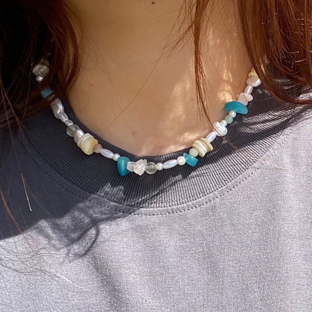Vòng Cổ vỏ sò hạt cườm thủy tinh mix đá xanh lam khóa càng cua thép không gỉ
