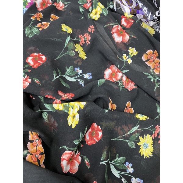 Vải voan Chiffon nền đen hoa nhỏ may áo kiểu, váy, đầm suông, áo dài MS20119