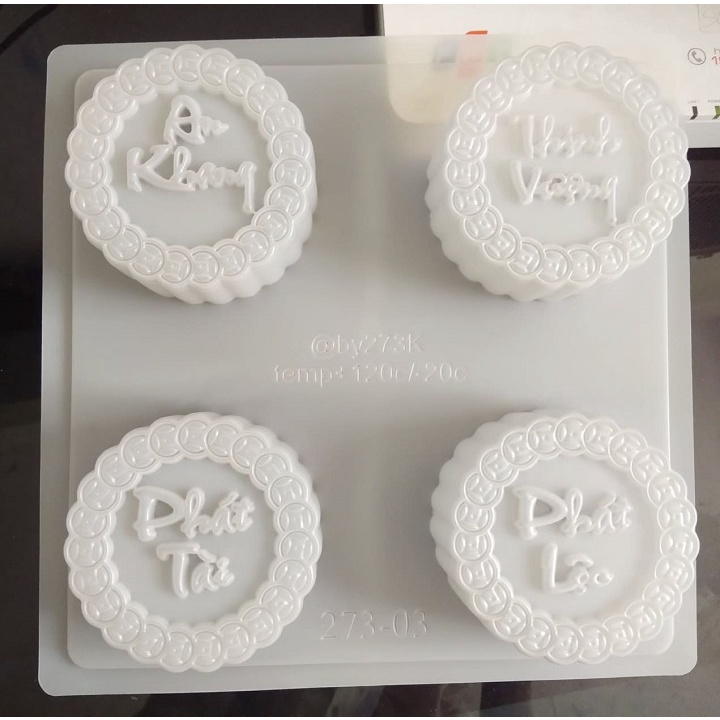 KHUÔN NHỰA HÌNH CHỮ AN KHANG, THỊNH VƯỢNG, PHÁT TÀI, PHÁT LỘC - Kiểu dáng: 4 ô /khuôn - Trọng lượng bánh làm ra khoảng 250 gram - Hình tròn: kích thước ô bánh : 9 cm x 9 cm, cao 3.5 cm - Chất liệu: nhựa cao cấp - Màu sắc:màu trắng sữa - An toàn với môi trường và sức khỏe con người