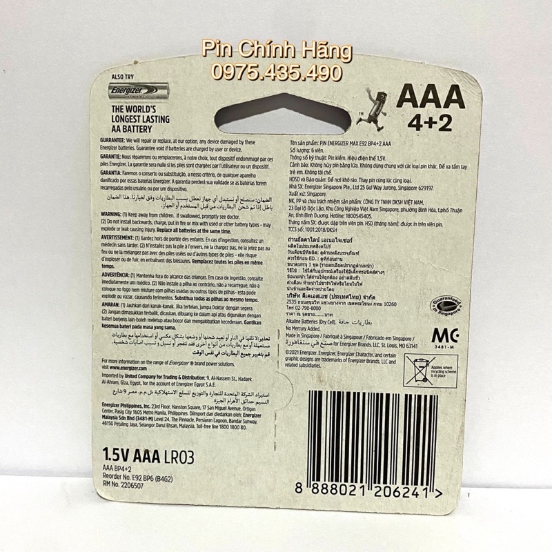 Thông Tin Sản Phẩm: Hãng sản xuất: Energizer (USA) Model: AA - E91BP4+2 (Pin Tiểu) AAA - E92BP4+2 (Pin Đũa) Chất liệu: Alkaline (Kiềm) Xuất Xứ: Singapore Điện áp: 1.5Volt Đóng gói: Vỉ 6 Viên Hạn Bảo Quản: 10 năm date liên tục cập nhật mới Pin dùng 1 lần không sạc lại Pin AA / AAA là các dòng pin thông dụng dùng cho các thiết bị như chuột không dây, máy cạo râu, đèn pin, đồng hồ, đồ chơi, máy đo huyết áp, micro,… Hãng pin Energizer được bầu chọn là thương hiệu pin bền nhất thế giới liên tục trong suốt nhiều năm qua là sự lựa chọn đáng tin cậy cho người dùng. Shop Shop Pin Chính Hãng là 1 trong số các đại lý cung cấp sản phẩm chính hãng Energizer chính hãng tại Việt Nam. Chúng tôi cam kết mang tới quý khách hàng: - Sản phẩm mới nhất - chính hãng 100% (không chính hãng hoàn tiền 200%) - chăm sóc, tư vấn tận tình - chuẩn bị đơn hàng nhanh chóng Rất mong được chăm sóc và phục vụ quý khách hàng. Mọi thắc mắc quý khách hàng vui lòng liên hệ trực tiếp với shop hoặc liên hệ hotline 0975.435.490 Xin cảm ơn quý khách hàng !