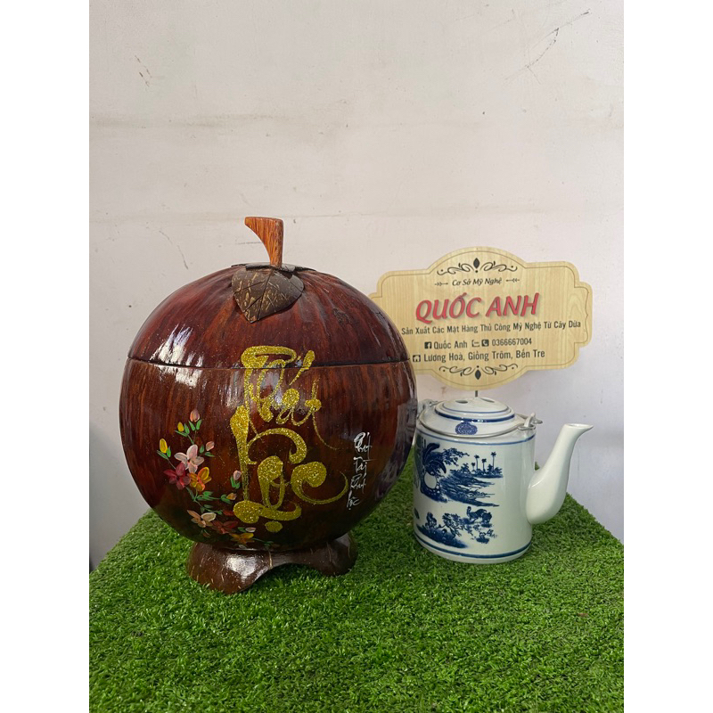 -Vỏ giữ ấm bình trà trái dừa vẽ chữ thư pháp: shop có vẽ sẵn cái chữ: Cha mẹ, Thọ, Lộc, Phát tài, Phát Lộc, Phúc, Tai... Khách chọn theo chữ mình thích nha. - Cam kết 100% sản phẩm đẹp như hình ạ. - Dung tích đựng ấm 1000ml -Hàng tuyển đẹp từng quả dùng biếu tặng ông