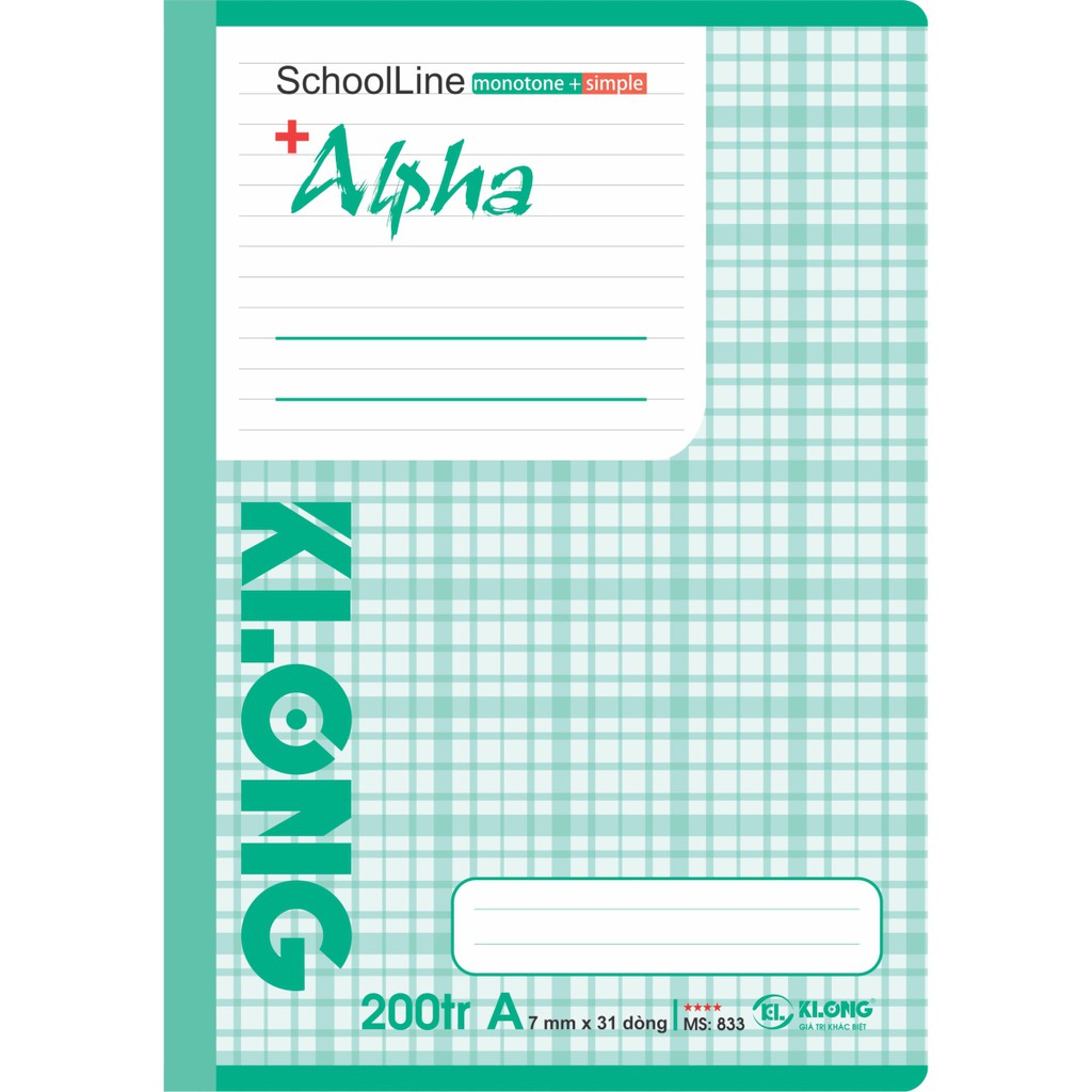 Vở kẻ ngang Alpha KLONG B5 200 trang 58/92; MS: 833 - Định lượng: 58 g/m2 - Độ trắng: 92% ISO - Số trang: 200 trang - Kích thước: (175 x 250) mm - Mã sản phẩm: 833 - Kích thước vở phổ thông B5 gọn nhẹ cho học sinh, phù hợp viết bút bi; - Loại giấy có định lượng mỏng 5