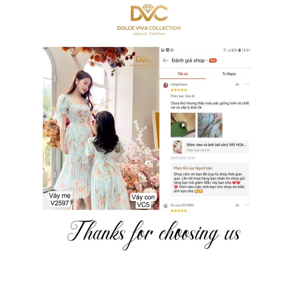 V2597, vc5 set váy voan hoa nhí mẹ và bé xanh mint dáng dài dập ly cổ tim đi biển - Dolce viva colection