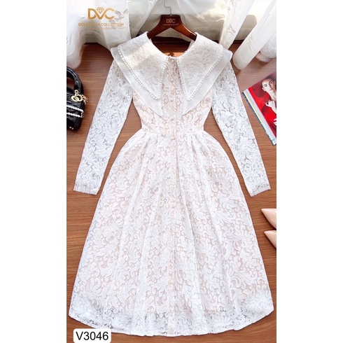 V3046 - váy ren xoè dài tay màu trắng và màu be