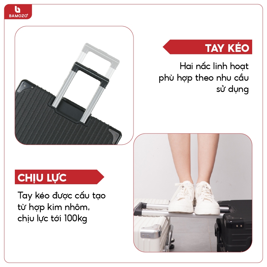 I. ĐẶC ĐIỂM NỔI BẬT CỦA VALI BAMOZO KHUNG NHÔM - Chất liệu nhựa PC+ABS có độ dẻo cao, chịu lực tốt với thiết kế bề mặt có vân chống xước, không thấm nước, dễ vệ sinh, 4 góc bo kim loại chống va đập mạnh. - Khóa số TSA đạt chuẩn Hoa Kỳ, đảm bảo an toàn tuyệt đối, chống