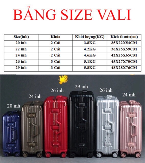 VALI KHUNG NHÔM/ KHOÁ SẬP/ CHỐNG XƯỚC Đủ size 20/24/29